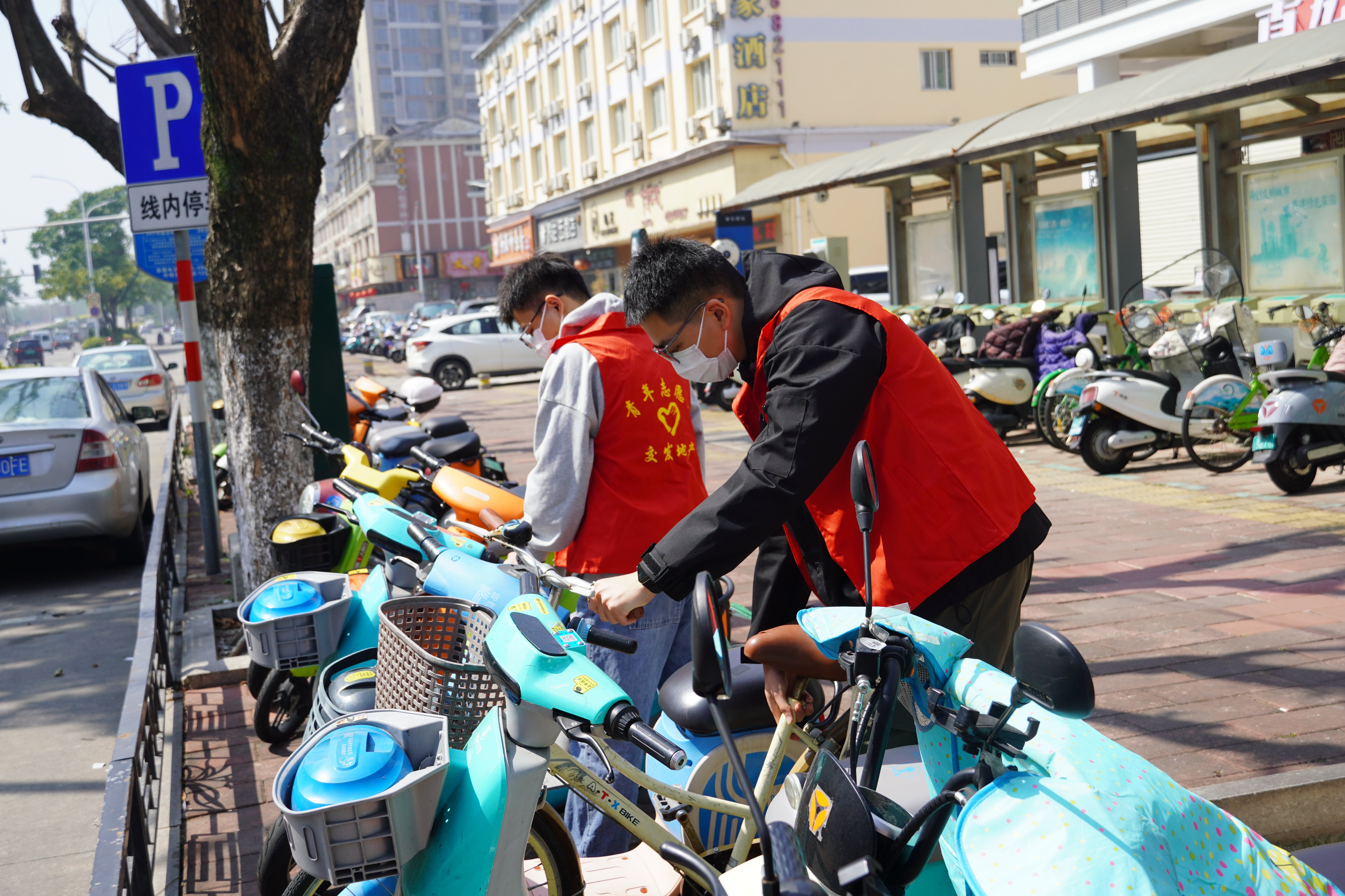 在共享單車(chē)點(diǎn)位,志愿者們對(duì)個(gè)別亂停亂放亂靠的非機(jī)動(dòng)車(chē)及共享單車(chē)進(jìn)行擺正、歸位,共同維護(hù)交通環(huán)境。